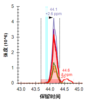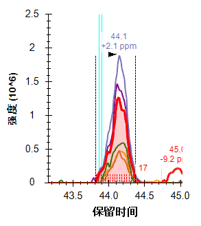 在 41.70 分钟处,它们已移出 +/- 20 ppm 的提取范围: