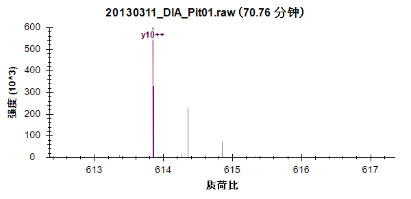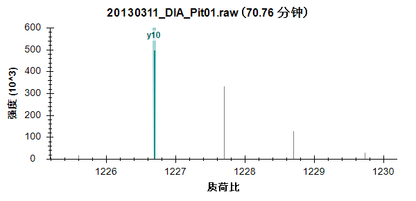 可以看到,对您刚刚在色谱图上单击的点做出贡献的串联质谱峰突出显示为浅绿色,并标注有 y10。从同位素峰相距 1 质荷比这一点,可以更加确信它们是由单电荷离子产生的。