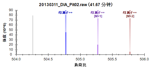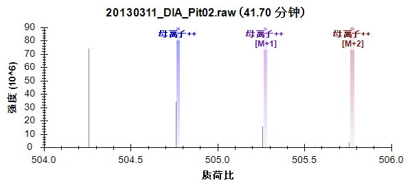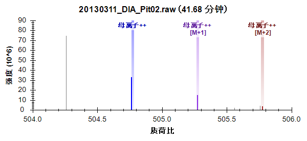 质心模式峰的强度显示为棒状。用于在色谱图上创建点的强度以色谱图颜色突出显示,提取范围显示为阴影区域。您可以看到未提取到阴影峰右侧的 M+3 和 M+4 峰。您所查看的产生干扰峰顶点的谱图在这个母离子积分峰的左边。您可以看到比目标肽段重 1 道尔顿的双电荷母离子的完整同位素分布。它的单同位素峰非常接近目标的 M+1。