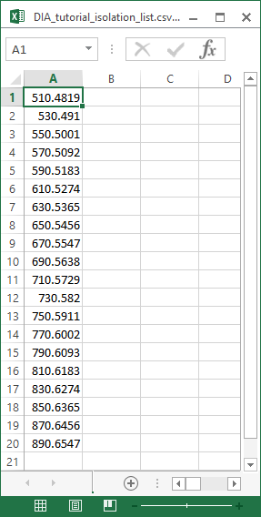 如果这是真正的 DIA 实验,您将使用此分离列表文件来在仪器上运行 DIA 采集。另外,也可以简单地在仪器软件中手动指定分离方案。数据采集的其它方法参数(例如串联质谱分离宽度和分辨率)需要在方法文件中手动设置。