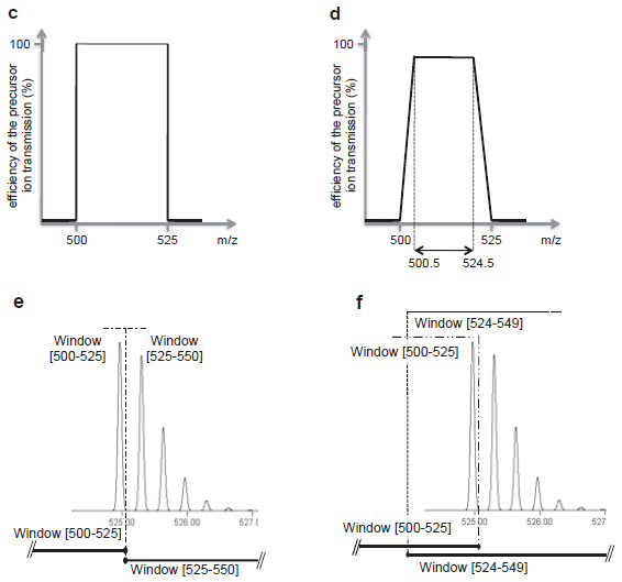 来自 Gillet 等人的补充图 S1。MCP 2012:c) 显示所定义范围的完美矩形分离,d) 显示在定义的四极分离范围边缘超过 0.5 质荷比的信号衰减不太理想,e 和 f) 显示完整的同位素分布如何在带有和没有重叠边缘的窗口之间分割。务必记住,虽只针对单同位素质荷比,但整个同位素分布均被分离,因此即便单同位素母离子质荷比看似很接近分离窗口的边缘,但也可以获得很强的碎片离子信号。