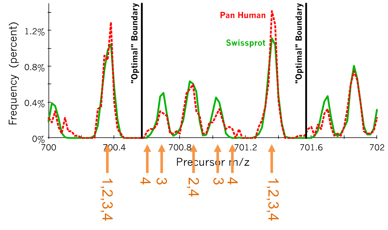 这样一来,窗口边界将优化到大约 0.25 质荷比,这里可能出现电荷 1 和 2 的肽段母离子。电荷 3 和 4 的一些母离子可能更接近这些边界,但在使用 20 质荷比窗口时,如果 Q1 分离在边界3 处合理有效时,这些窗口应当仍然很少发生,从而减轻了对 SWATH2 原始论文中提出的窗口重叠边缘的需要。